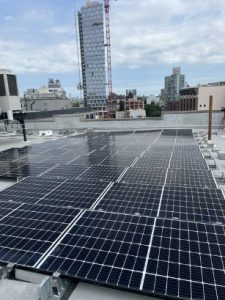 Solar panels on the roof of Catholic Charities Brooklyn and Queens Bishop Thomas V. Daily Residence in Prospect Heights, Brooklyn, the first affordable housing development to be included in the housing portfolio of Catholic Charities Progress of Peoples Development Corporation (CCPOPD), the affordable housing developer of Catholic Charities Brooklyn and Queens.