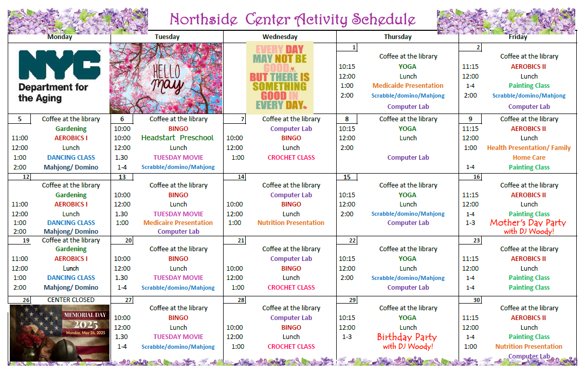Join us at Northside Older Adult Center on Thursday, May 1st for Yoga, Computer Lab and more!